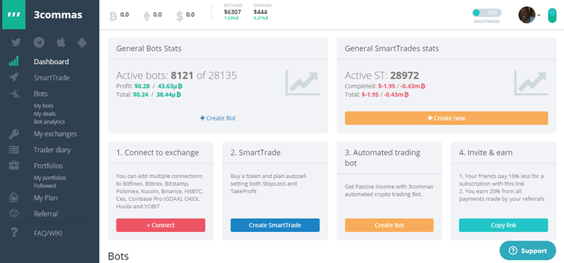 The platform is generally quite easy to navigate, even for new traders, and the trading bots are easy to set up. Various features are easy to access from inside your account, and connecting to an exchange, and setting up smart trades and bots can be done at the click of a button. The Dashboard is also well laid out, and the side panel allows users to quickly select their preferred tabs and features.