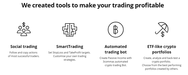 3Commas is a comprehensive cryptocurrency trading platform that allows its users to make use of automated trading bots as well as follow and copy the actions of successful traders and to create and track top portfolios.