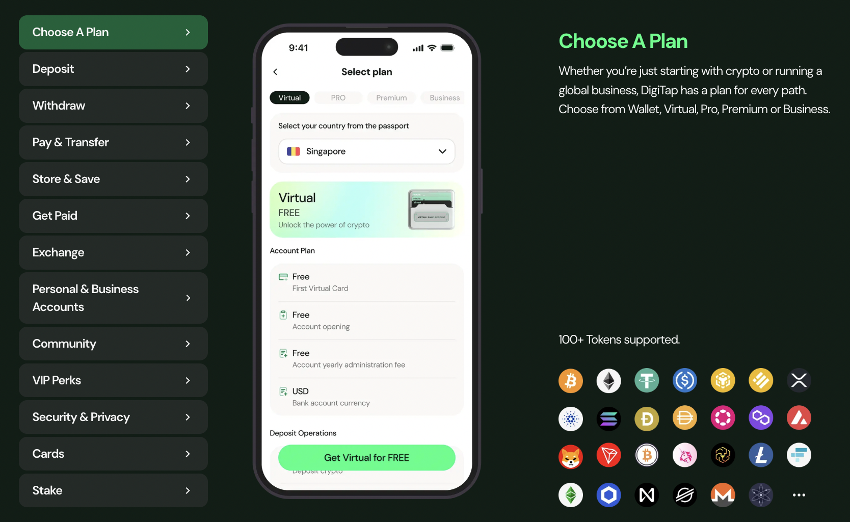 The app supports more than 100 cryptocurrencies, as well as major fiat currencies such as USD and EUR. Users can transfer funds, send global payments, and use the Digitap Visa card to pay anywhere Visa is accepted.