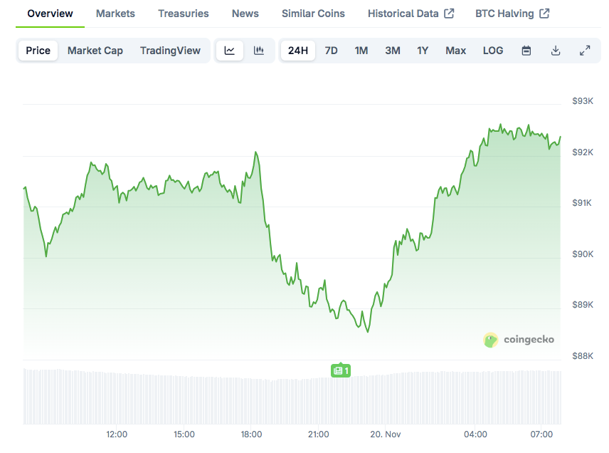 Bitcoin price currently trades at $92,749 based on CoinGecko data. The asset is up 1.88 percent in the past 24 hours but remains down 9.44 percent over the week.