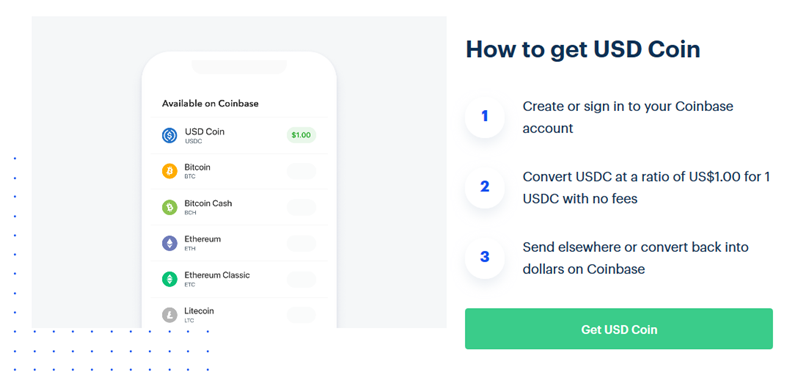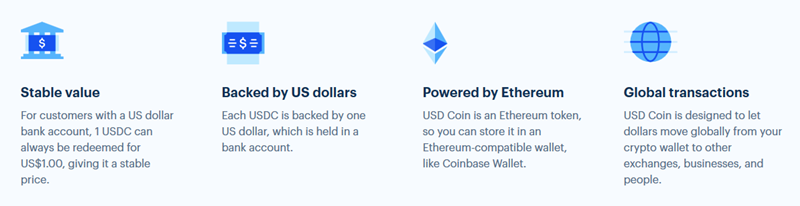 Coinbase also supports the USDC currency (USD Coin), an ERC-20 token and “stablecoin” with a price pegged to the price of the US Dollar. As a result, holders of the coin will always be able to redeem 1 USD Coin for US$1.00 and protect themselves from the volatility of holding digital assets such as Bitcoin and Ethereum.