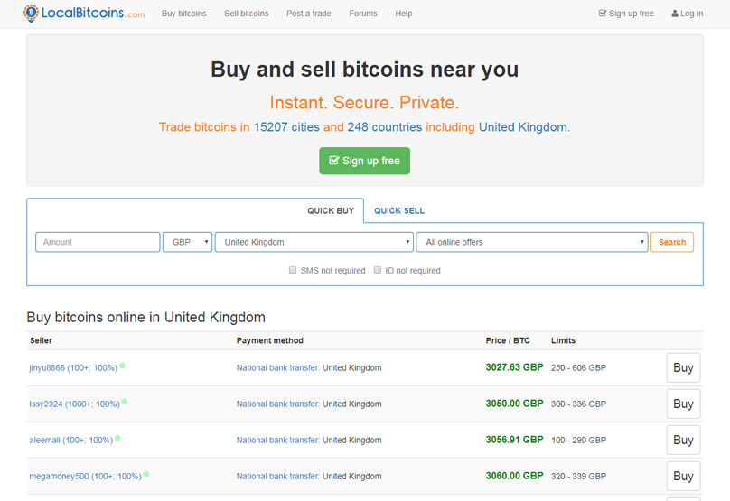LocalBitcoins is a peer-to-peer cryptocurrency exchange used in most big cities around the world. The general principle behind this exchange is that you can find people who live in your area or city and meet with them in person to conduct an exchange. The platform also offers options for purchasing digital currencies via PayPal, Square, direct-to-bank transfers, and many other payment-processing methods. The platform charges a small fee of 1 percent per transaction in cases where sellers apply their own exchange rate.