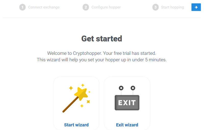 From here you can simply follow the wizard as it will help you to quickly configure your hopper. You just need to select an exchange and configure the bot via your preferred exchange’s API keys and also set up basic hopper configurations. The process is very straightforward and there are links to tutorials and additional useful information on each step.