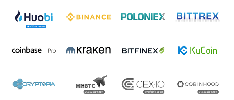 OKEX / KuCoin / Bitvavo / Binance / Binance US / Coinbase Pro Bittrex / Poloniex / Kraken / Bitfinex / Huobi |